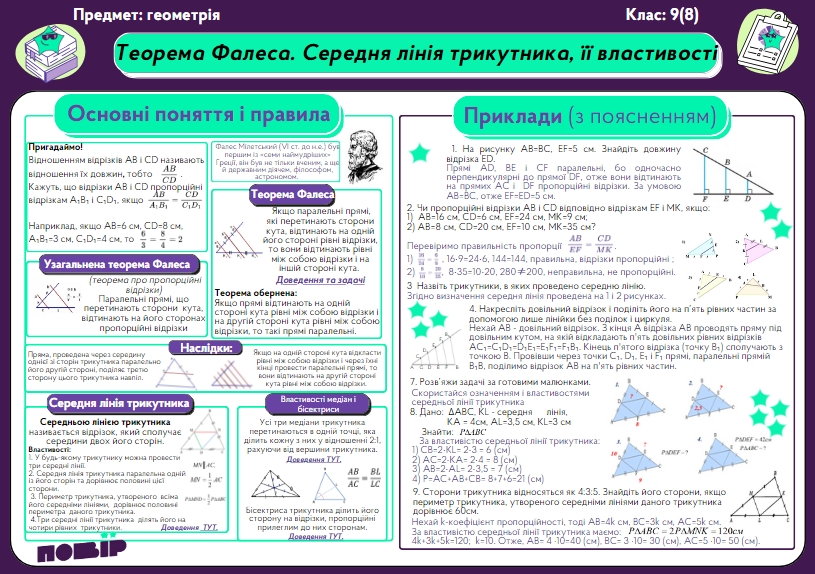 Теорема Фалеса. Середня лінія трикутника, її властивості