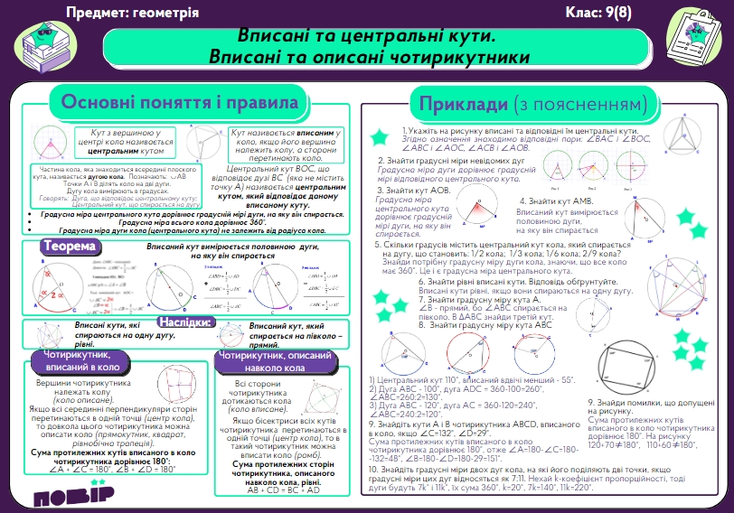 Вписані та центральні кути. Вписані та описані чотирикутники.